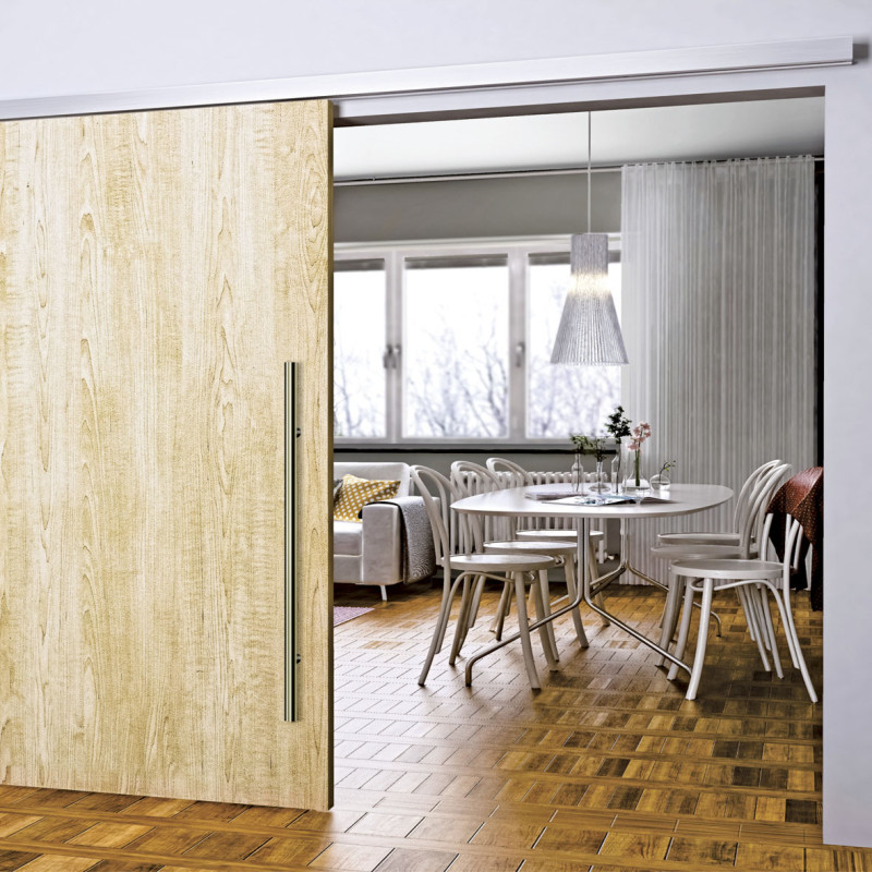 Système de rail en aluminium robuste et résistant, spécialement conçu pour portes coulissantes apparentes.